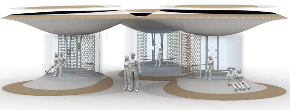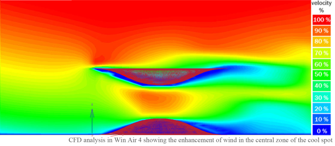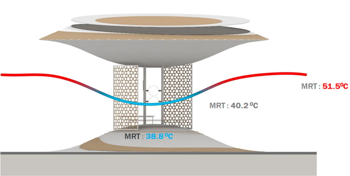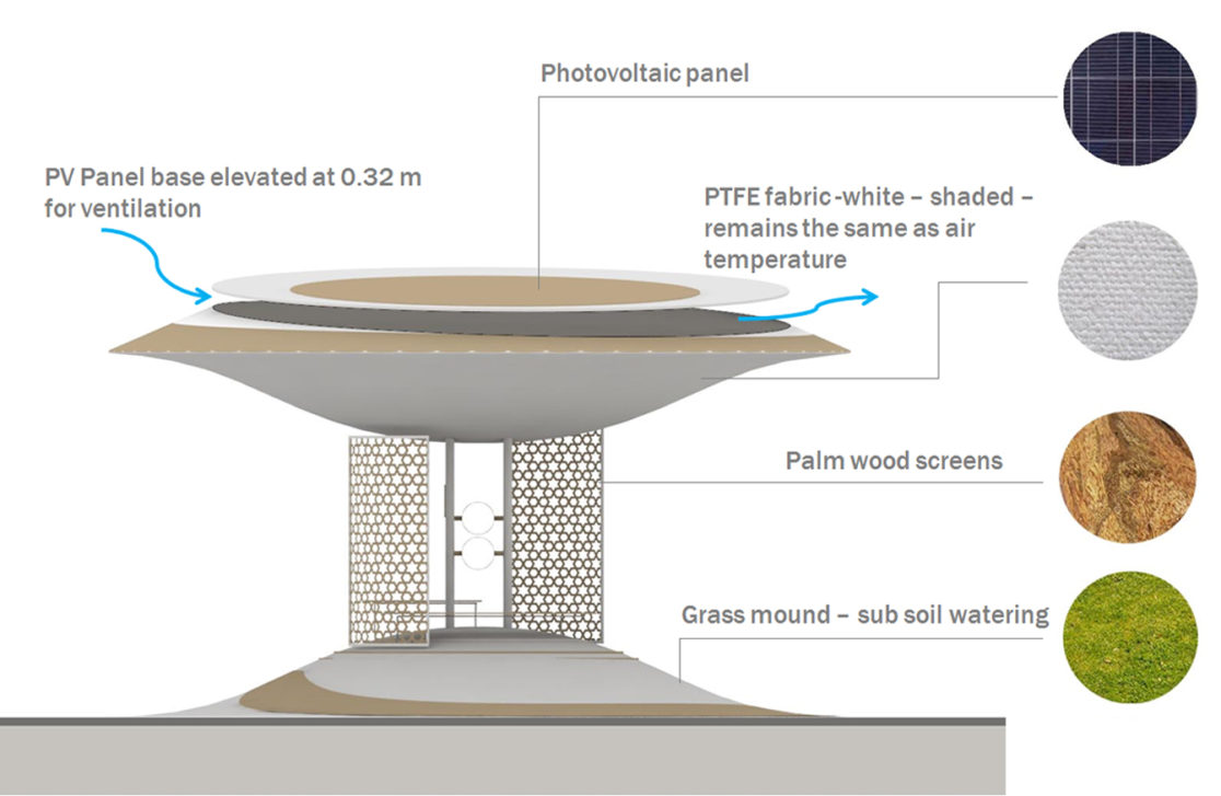 This urban design project proposed for the city of Sharjah, in UAE, enhances pedestrian comfort by providing shade, improving wind movement and reducing mean radiant temperatures (MRT). The design and material choices of the cool spots reduce MRT by 12 degree Celsius and physiologically felt temperature by 10 degree Celsius.